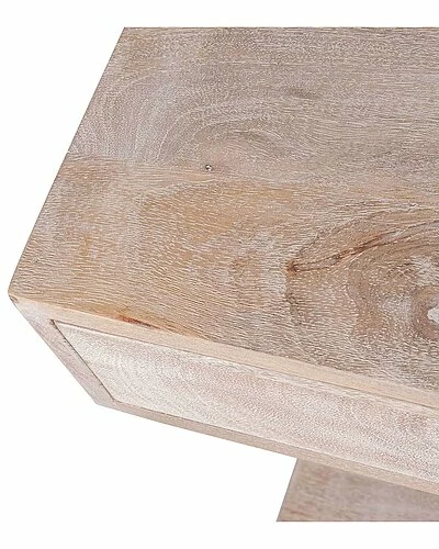 - This end table has a C-shape silhouette in a modern design. Made of Mango wood this table features a raw finish and a drawer for storage. Place this end table next to a couch or use it as a nightstand.