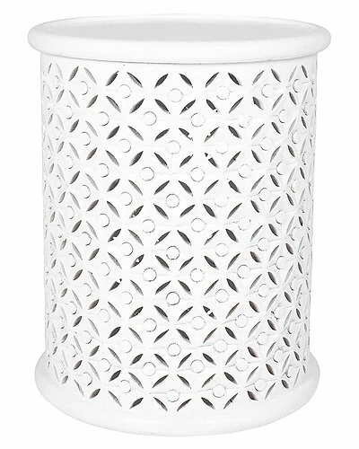 - The table will add effortless style and texture to your space. Crafted in India of mango wood, this table features a drum shape and an intricately carved cut out the pattern. You can use this side table to display a vase or lamp or even have it double.
